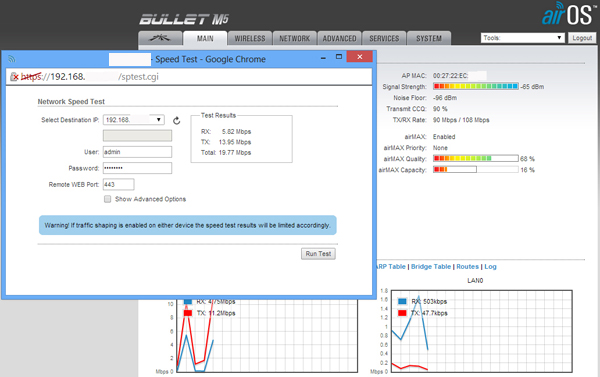 Radio Airgrid M5Hp 27dBi. Hasil speed test Rx: 22,66 Mbps dan Tx: 18,76 Mbps